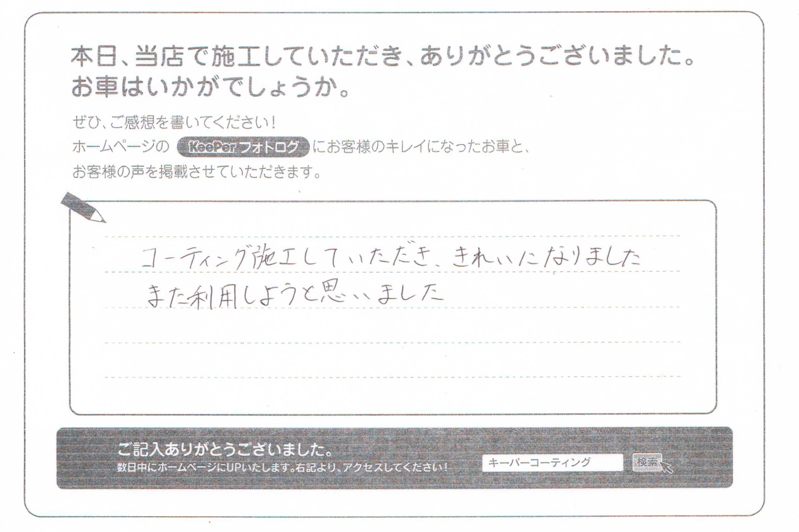 自分も新車に変えたのでクリスタルキーパーお願いします。」