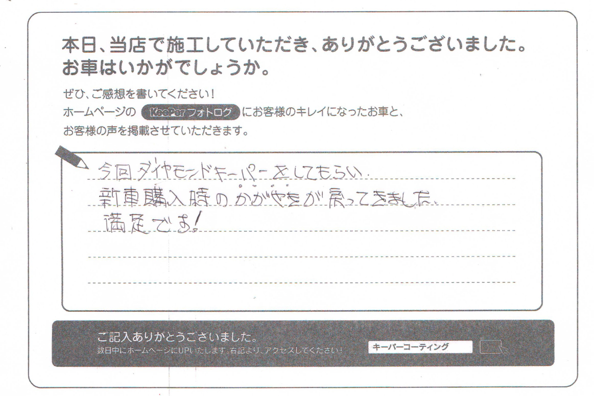 ダイヤモンドキーパー施工で、新車購入時の輝きが戻って大満足!! 「ダイヤモンドキーパー」